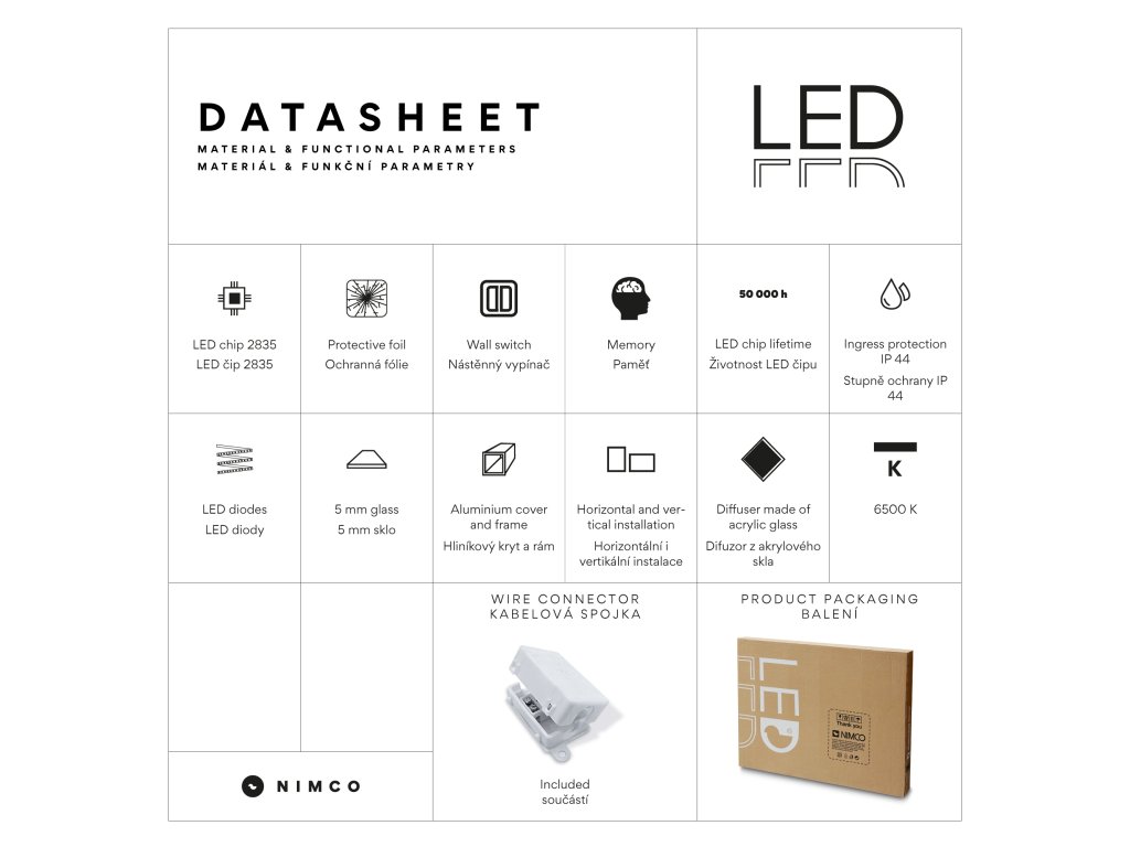 Zrcadlo využívá nejmodernější LED čipy SMD 2835, které jsou známé svou vysokou svítivostí, energetickou úsporností a dlouhou životností. Hustota čipů 96/m, životnost 50 000 hodin. Parametry LED: Survival Factor = 1, Lumen Maintenance Factor 0,99 a Flicker Metric 0,02, pak zajišťují stabilní, bezblikavé a dlouhodobě konzistentní osvětlení.