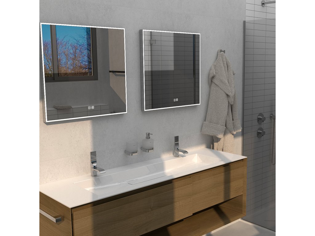 Čtvercové zrcadlo s rámem s ostrými rohy a celoobvodovým svícením pro dokonalé a rovnoměrné osvětlení.Zrcadlo se ovládá dvěma dotykovými podsvícenými senzory, které umožňují změnu barvy světla, nastavení intenzity osvětlení (stmívání) a disponují paměťovou funkcí pro uložení posledního nastavení. Kromě toho lze zrcadlo ovládat i pomocí nástěnného vypínače, což zvyšuje jeho flexibilitu a pohodlí použití.