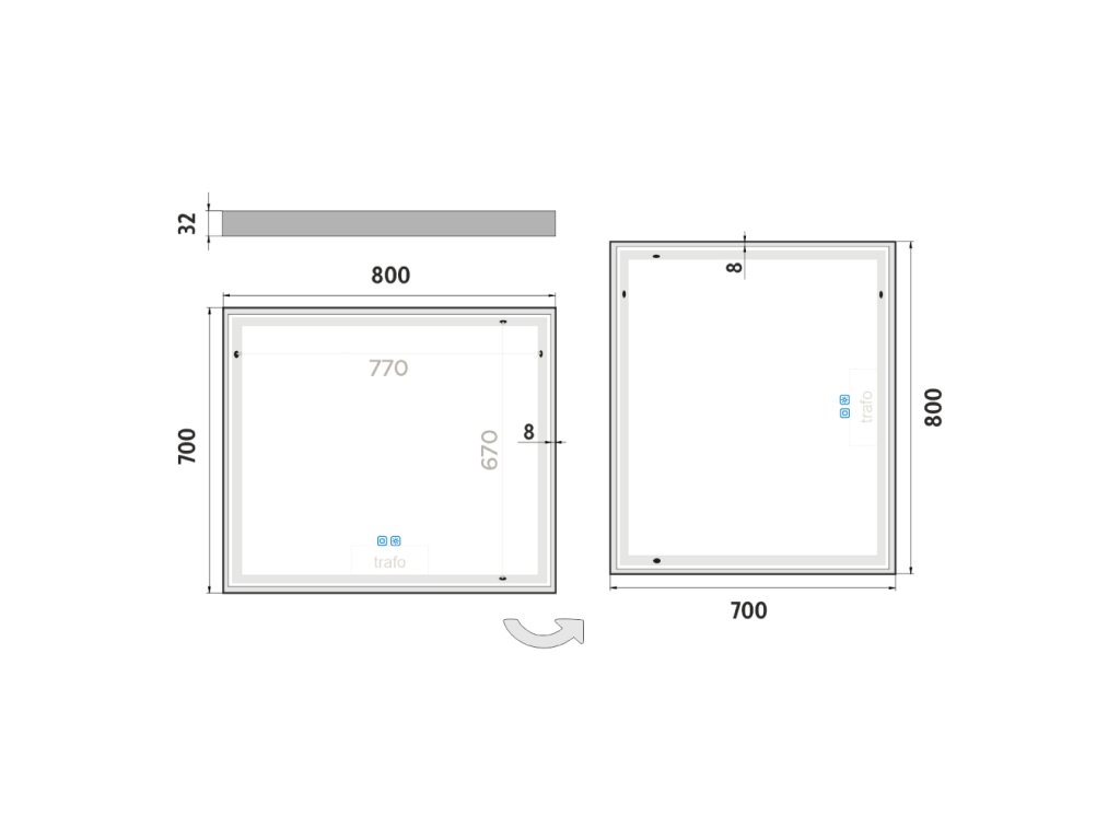 LED zrcadlo 800x700 se dvěma dotykovými senzory OBDELNÍKOVÁ - OSTRÉ ROHY - ZP 13003VX