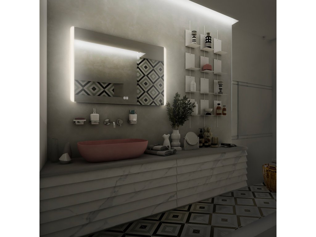 Obdélníkové bezrámové zrcadlo s oblými rohy a podsvícením ze stran pro moderní a elegantní vzhled.Zrcadlo se ovládá dvěma dotykovými podsvícenými senzory, které umožňují změnu barvy podsvícení, nastavení intenzity osvětlení (stmívání) a disponují paměťovou funkcí pro uložení posledního nastavení. Kromě toho lze zrcadlo ovládat i pomocí nástěnného vypínače, což zvyšuje jeho flexibilitu a pohodlí použití.
