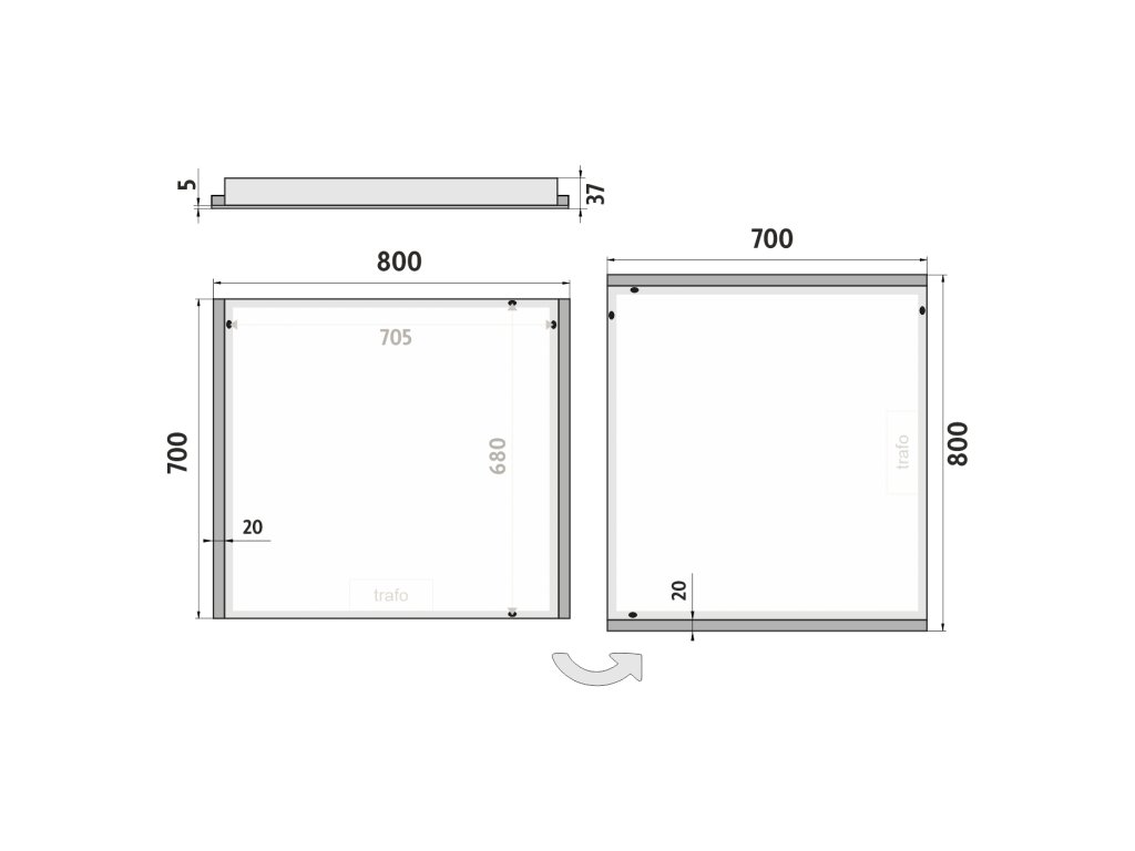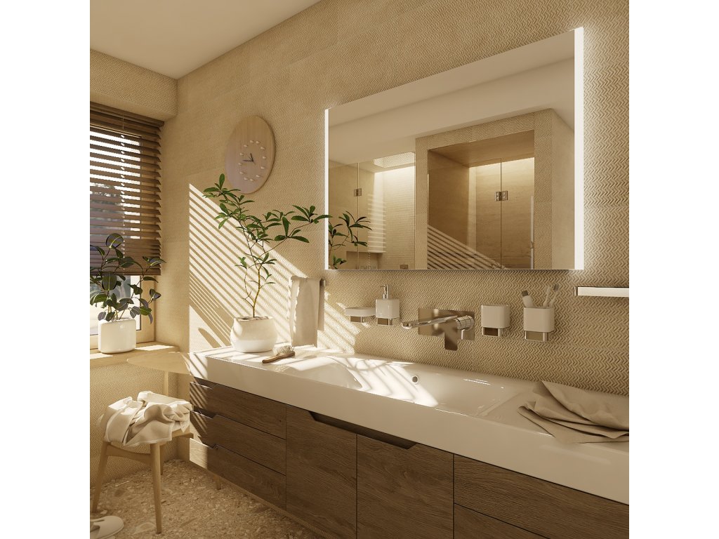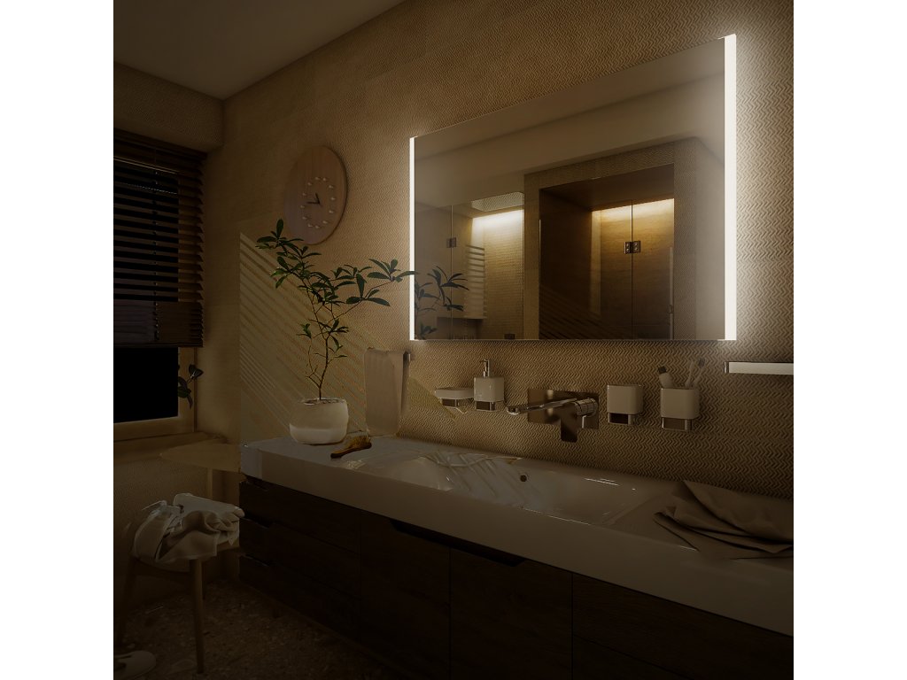 Obdélníkové bezrámové zrcadlo s ostrými rohy a podsvícením ze stran pro moderní a elegantní vzhled.Zrcadlo bez integrovaného vypínače je určené k připojení a ovládání nástěnným vypínačem. Barva podsvícení zrcadla je pevně nastavena.