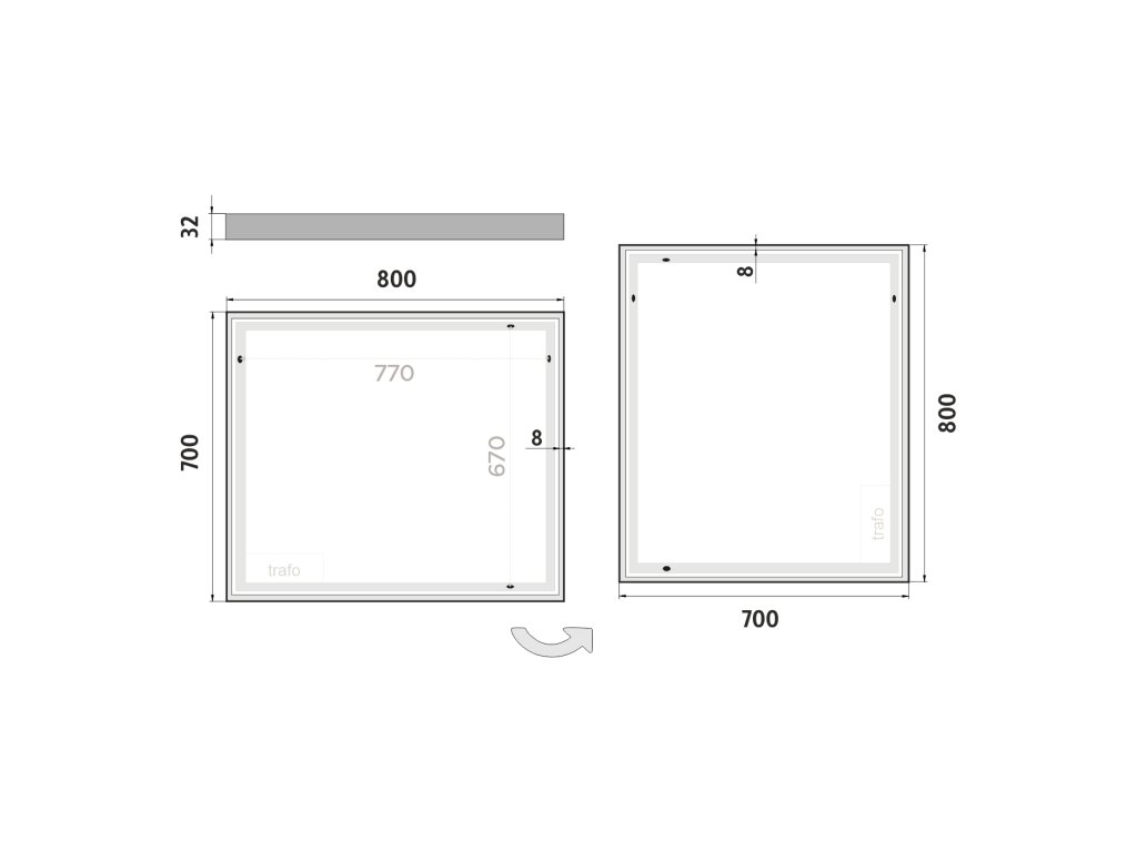 Obdélníkové zrcadlo s rámem s ostrými rohy a celoobvodovým svícením pro dokonalé a rovnoměrné osvětlení.Zrcadlo bez integrovaného vypínače je určené k připojení a ovládání nástěnným vypínačem. Barva světla zrcadla je pevně nastavena.