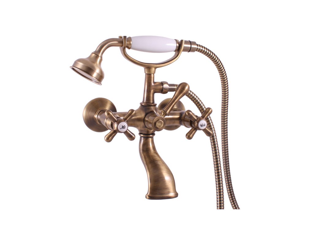Vodovodní baterie vanová nástěnná s vidlicí na odkládání sprchy a sprchou.