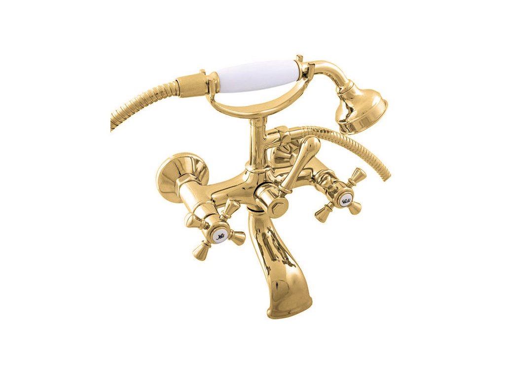 Vodovodní baterie vanová nástěnná s vidlicí na odkládání sprchy a se sprchou.