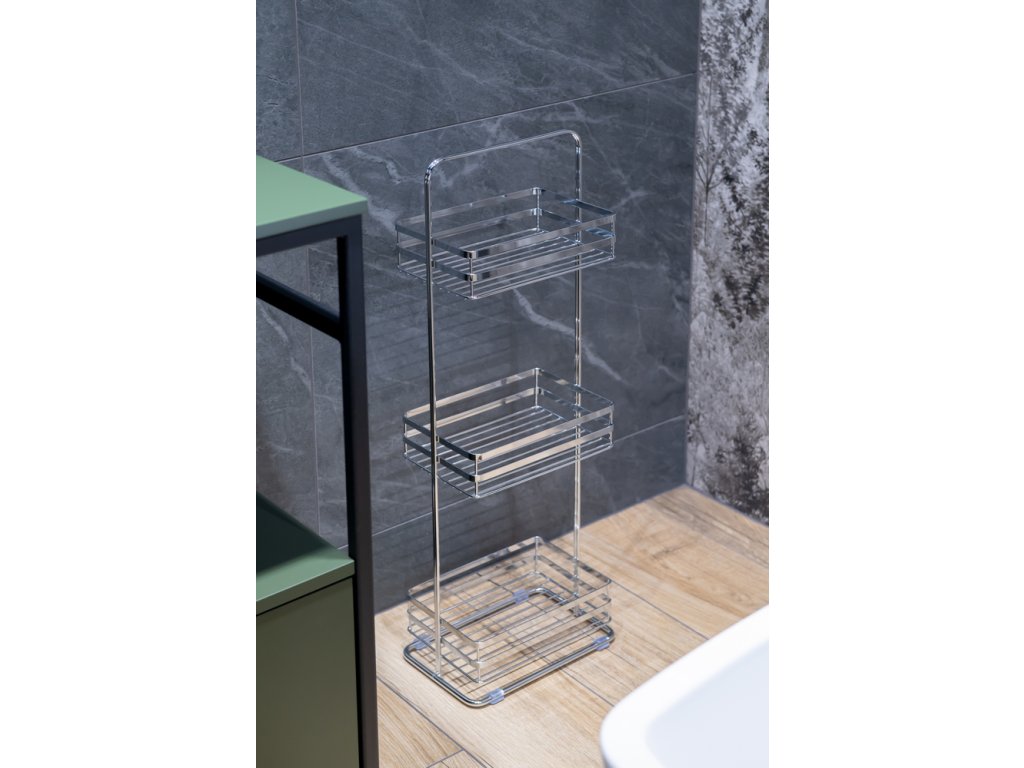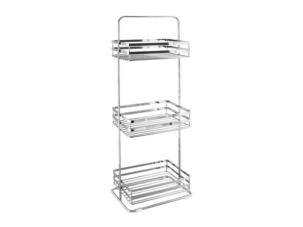 Police stříbrné barvy se 3 policemi, vyrobena z masivní oceli povrchově upravené lesklým chromem. Je těžká a velmi stabilní. Skvěle se hodí jako další úložný prostor jak v koupelně, tak v kuchyni. Jehí minimalistická a klasická forma bude dobře fungovat a doplní mnoho interiérových aranžmá v různých stylech. Na spodní straně má plastové nožky, které ochrání polici a povrch, na který bude umístěna, před poškrábáním a poškozením. Nepochybnou výhodou police je, že nevyžaduje montáž. Stačí jej umístit na vhodné místo a můžete si užívat jeho plnou funkčnost.