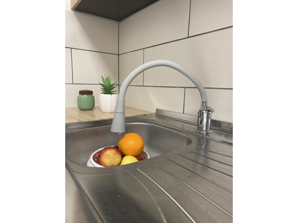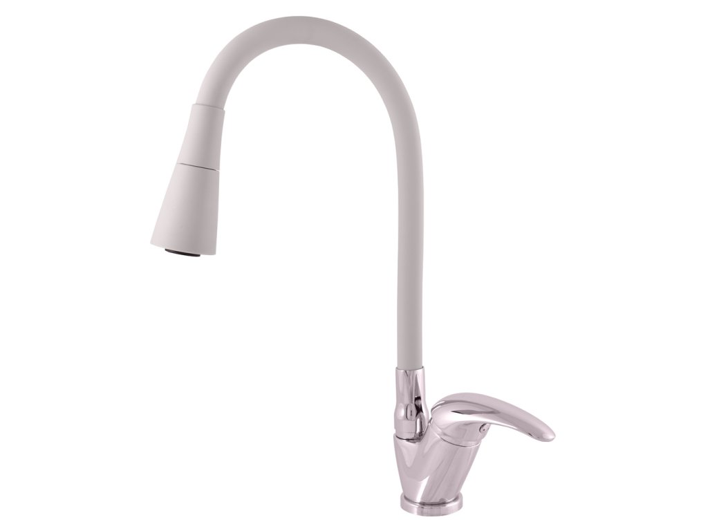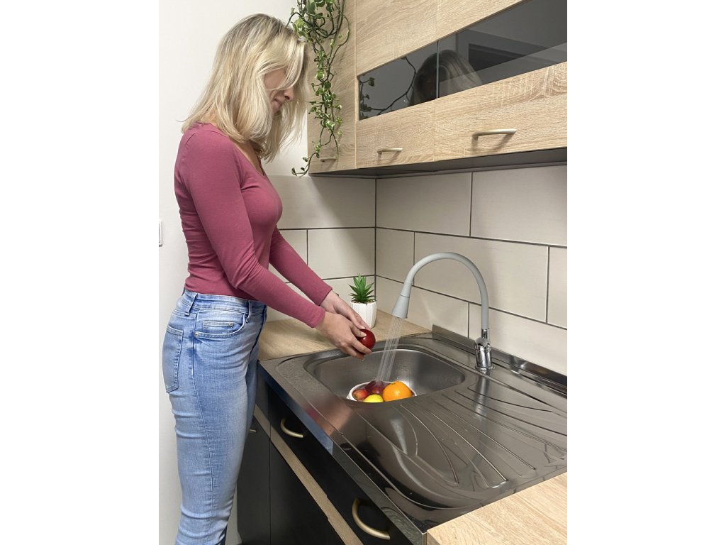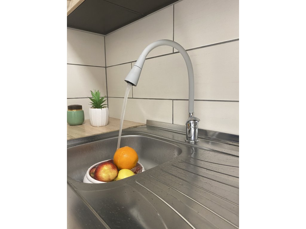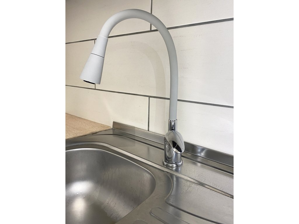 Vodovodní baterie dřezová stojánková s flexibilním otočným ramínkem se sprchou.