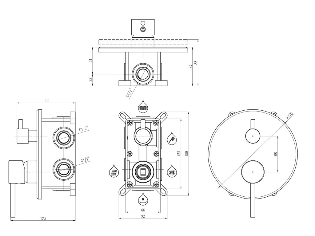 Tuto baterii můžete použít buď do sprchového koutu jako kombinaci tří prvků a nebo k vaně jako kombinaci např. napouštění přepadem, ruční sprcha a hlavová sprcha nebo výtokové ramínko, ruční sprcha a hlavová sprcha.
