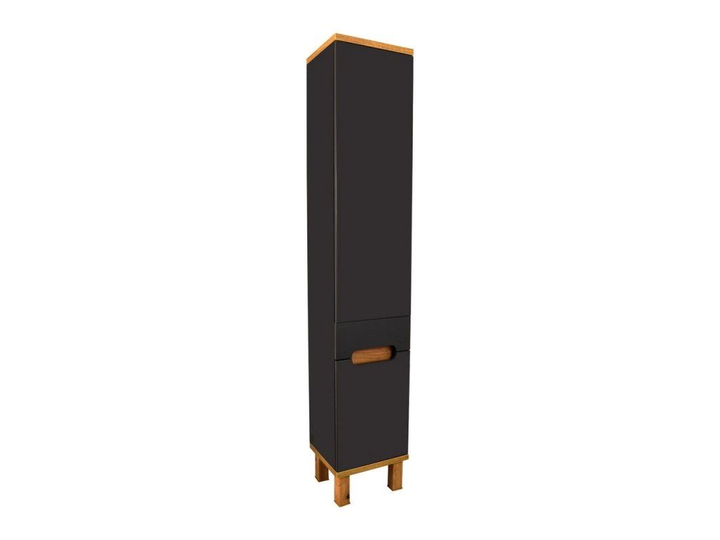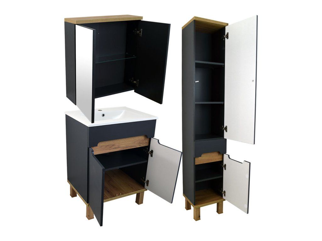 Série nábytku Orion v moderní kombinaci lakovaných ploch v šedé (antracitové) barvě a doplňků v dekoru zlatý dub. Jako základ si můžete vybrat skříňku v šířce 60 nebo 80 cm s keramickým umyvadlem nebo skříňku s horní deskou připravenou pro instalaci deskového umyvadla a tu pak doplnit zrcadlovou skříňkou. Součástí série jsou samozřejmě i doplňkové skříňky (nízká, vysoká, závěsná horní).