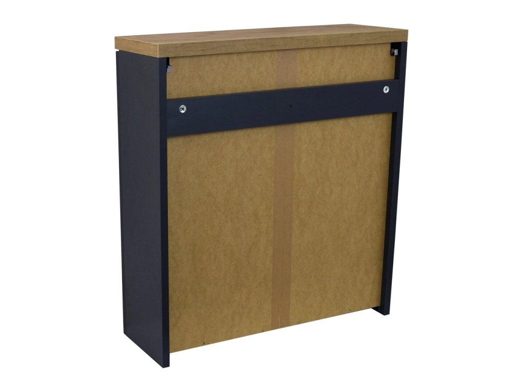 Korpus skříněk je vyroben z LTD desky tl. 16 mm v barvě antracit mat, doplněné o horní a spodní desku z LTD tl. 25 mm v dekoru zlatý dub. Čelní plochy a dvířka jsou vyrobeny z MDF desky tl. 16 mm s povrchovou úpravou matným antracitovým lakem a jsou kombinovány s dekorační lištou z LTD v dekoru zlatý dub. Pro ustavení na podlahu jsou skříňky vybaveny podpěrnými nožkami z MDF 50x50 mm s povrchovou úpravou fólií v dekoru zlatý dub.