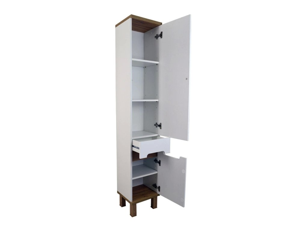Korpus skříněk je vyroben z LTD desky tl. 16 mm v bílé barvě, doplněné o horní a spodní desku z LTD tl. 25 mm v dekoru zlatý dub. Čelní plochy a dvířka jsou vyrobeny z MDF desky tl. 16 mm s povrchovou úpravou lesklým bílým lakem a jsou kombinovány s dekorační lištou z LTD v dekoru zlatý dub. Pro ustavení na podlahu jsou skříňky vybaveny podpěrnými nožkami z MDF 50x50 mm s povrchovou úpravou fólií v dekoru zlatý dub.