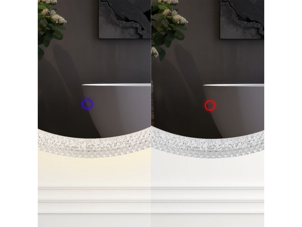 Vestavěný dotykový spínač umožňuje pohodlné ovládání podsvícení. Při aktivním osvětlení svítí tlačítko modře, při vypnutí mění barvu na červenou, což signalizuje stav zrcadla.
