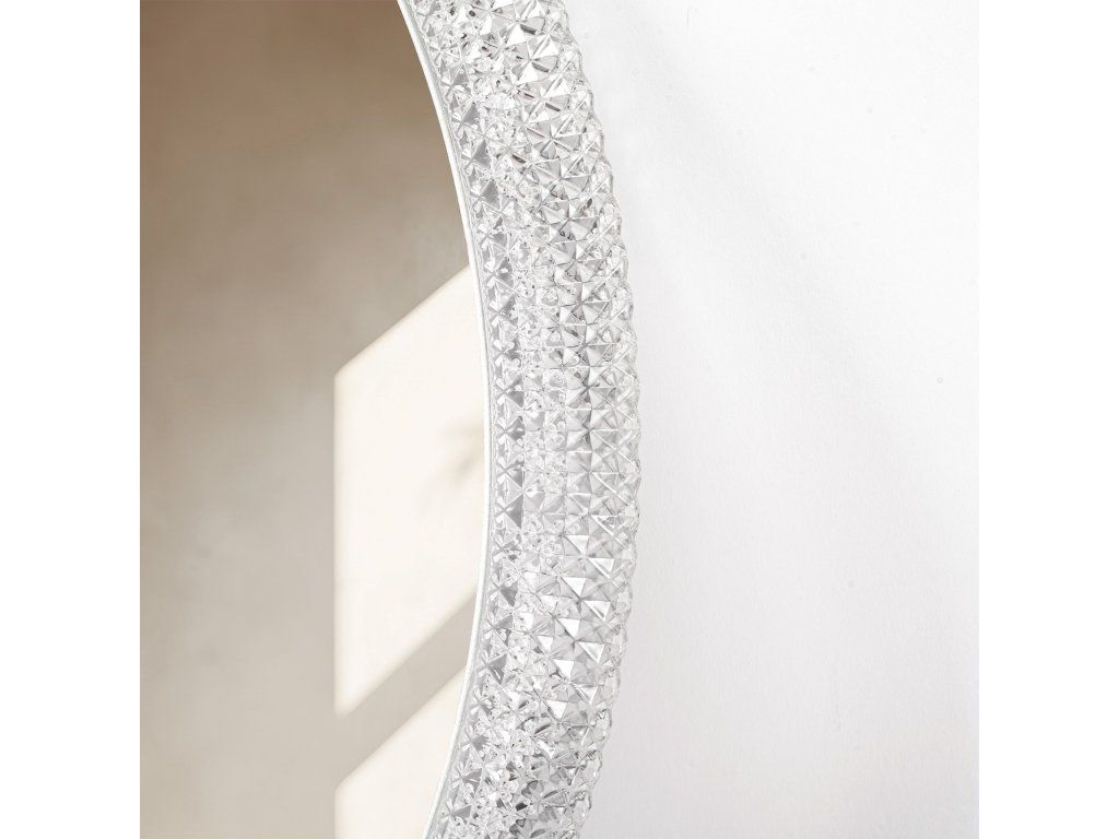 Kulatý tvar a dekorativní rám s texturou připomínající krystal jemně rozptyluje světlo, vytvářející jemné odrazy, které dodávají interiéru jedinečnou atmosféru.