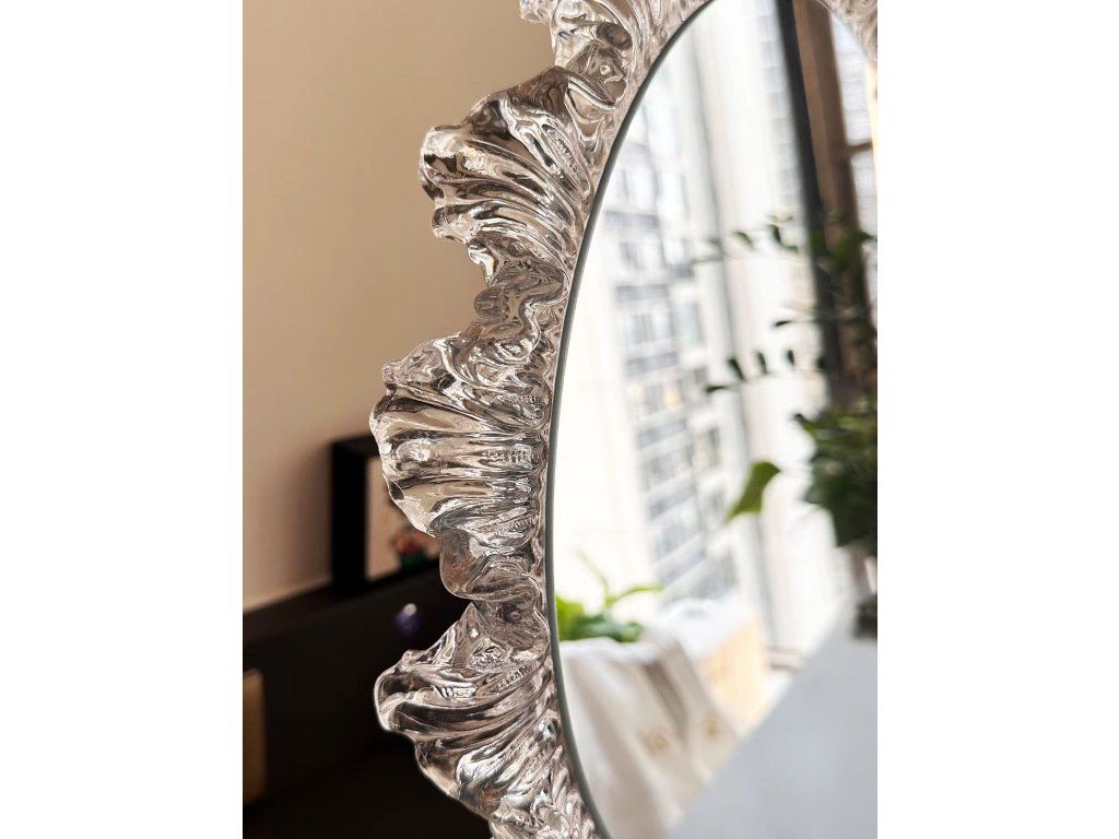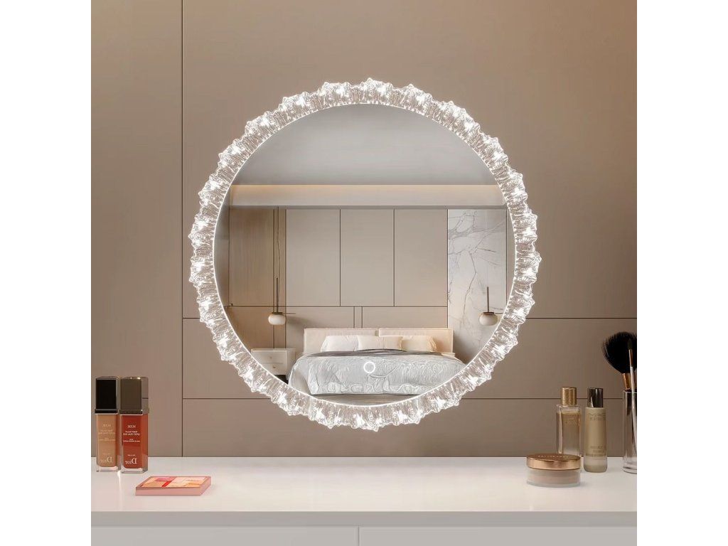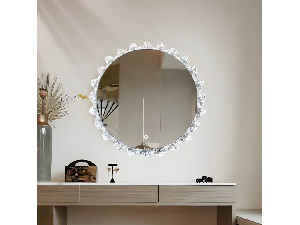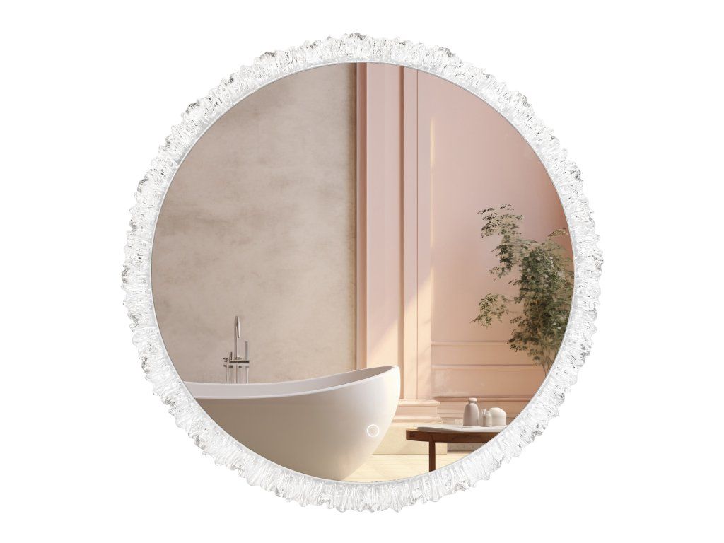 Kulatý tvar a dekorativní rám, který jemně láme světlo a vytváří ohromující odrazy, přidává interiéru jedinečný charakter.