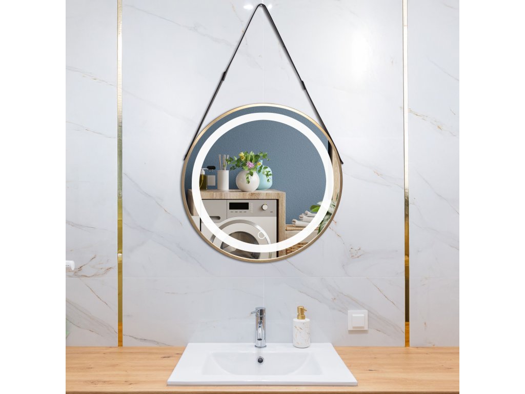 Elegantní LED zrcadlo s koženým páskem a zlatým oválným rámem je dokonalé spojení moderního designu a funkčnosti. Dodatkově má zrcadlo vestavěné podsvícení, které ještě více prosvětluje vaše místnosti.