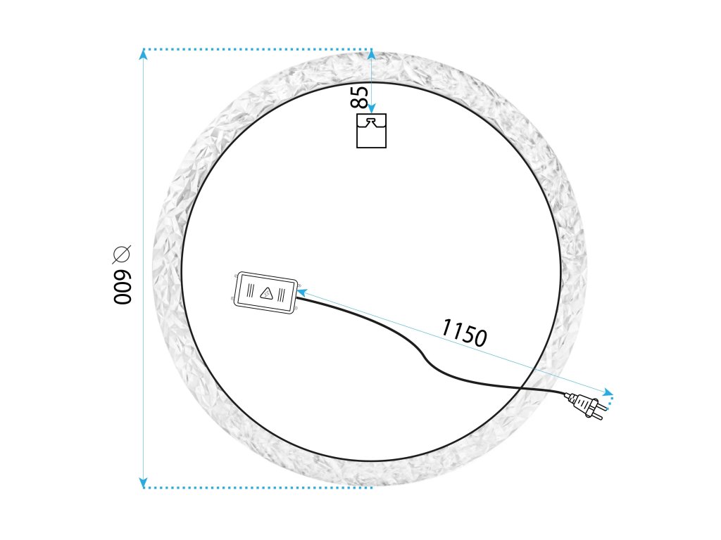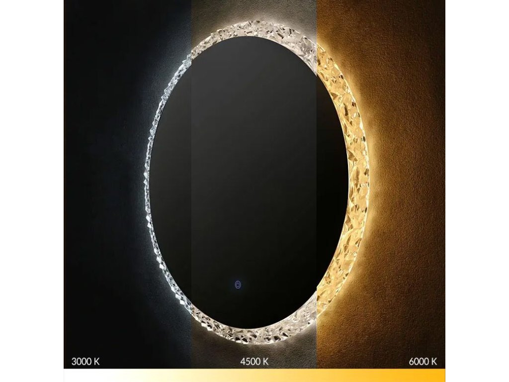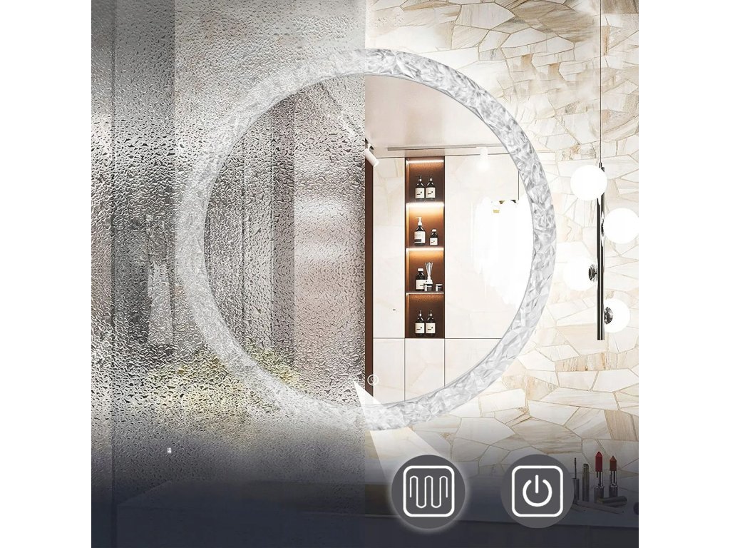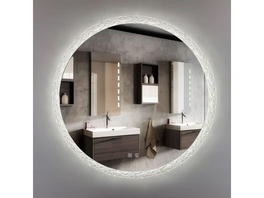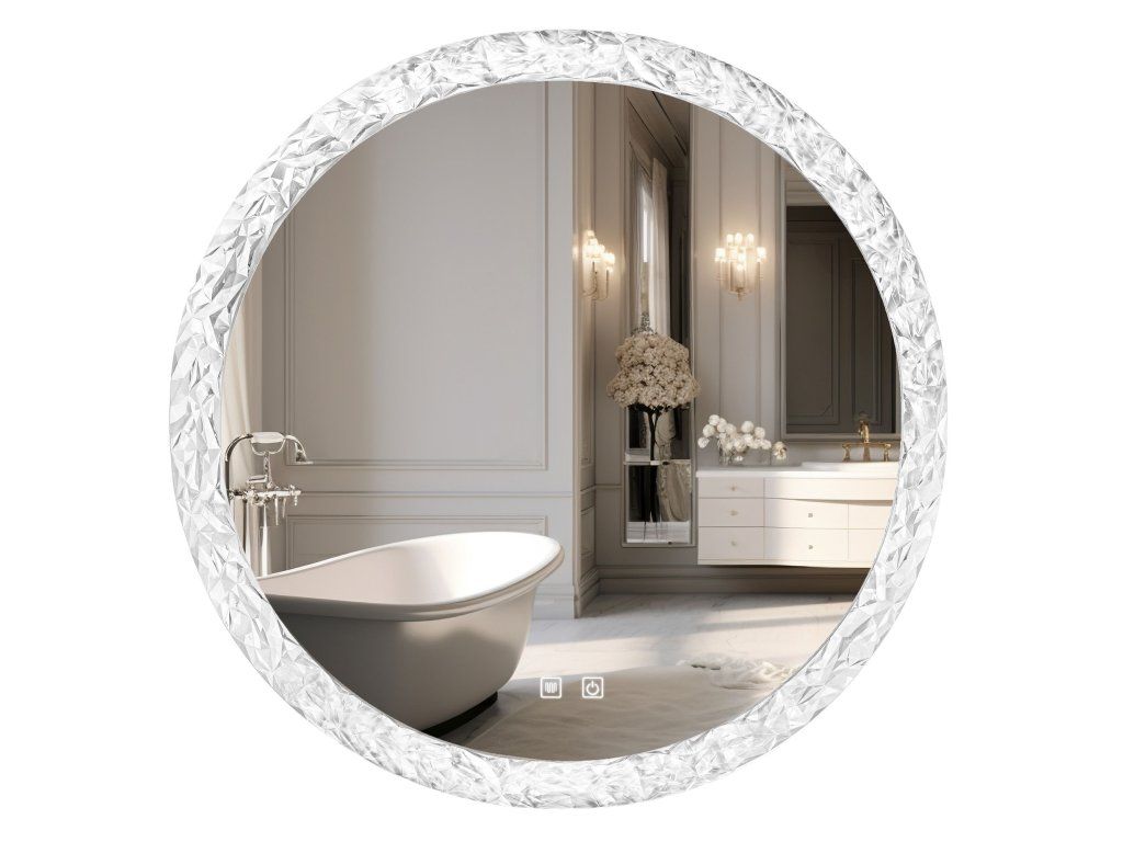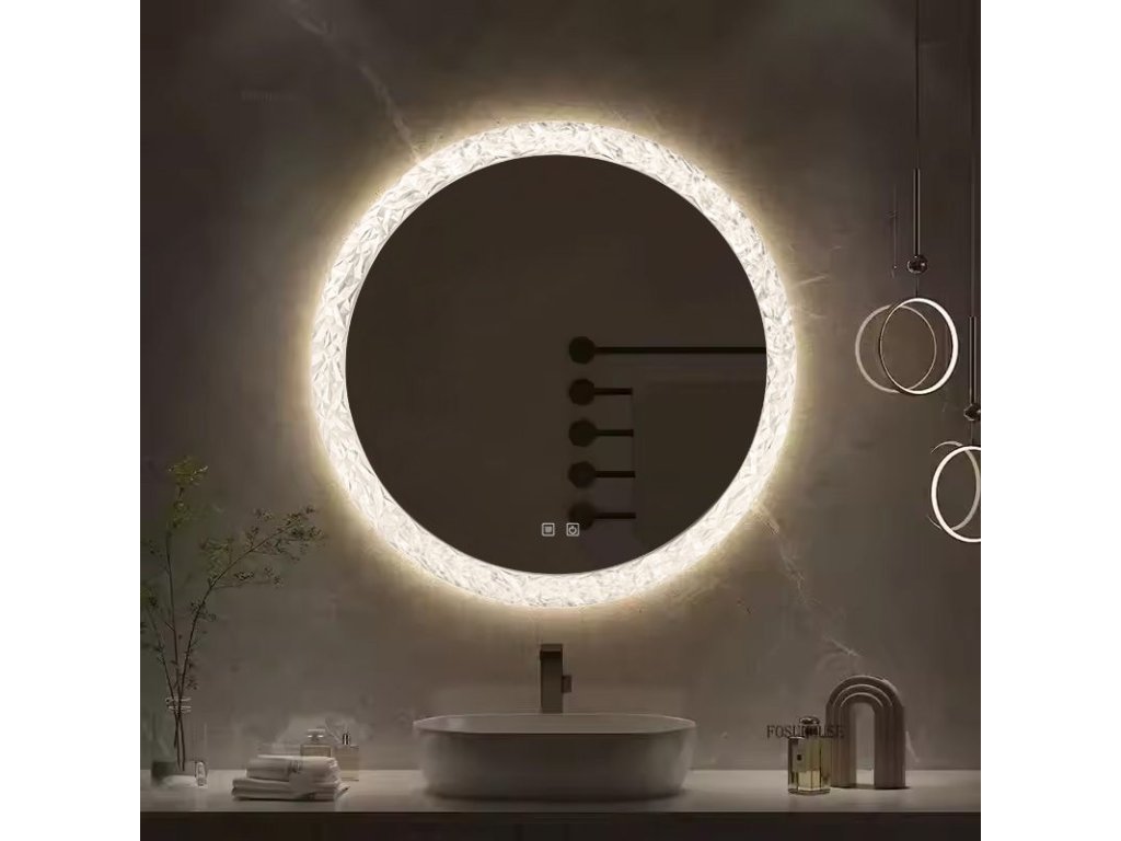 Moderní LED zrcadlo s dekorativním akrylovým rámem je elegantní doplněk do každé koupelny nebo šatny. Kulatý tvar a efektní rám s texturou připomínající broušený krystal jemně láme světlo, vytvářející jedinečné odrazy, které přidávají interiéru prestiž.
