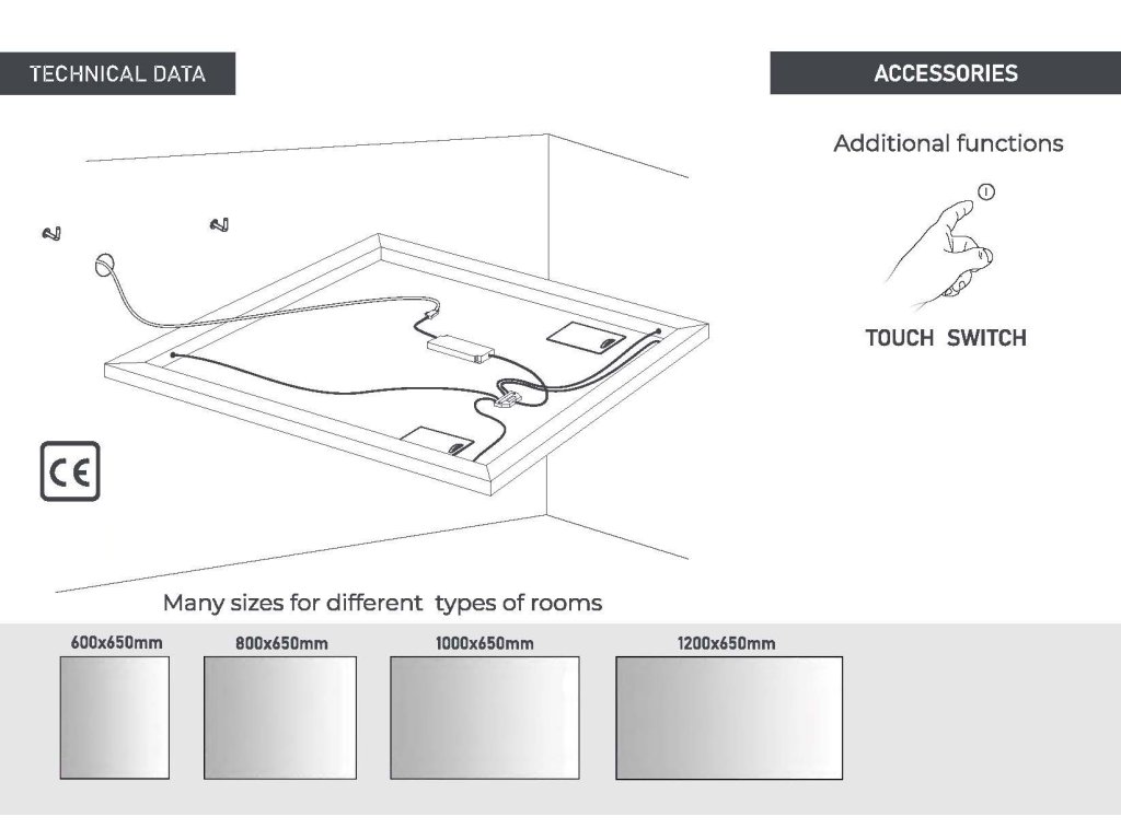 Zrcadlo je dodáváno ve dvou variantách: bez vypínače (v tomto případě je nutné zrcadlo napojit na el. instalaci a vypínač instalovaný ve zdi) nebo s dotykovým vypínačem (TS).