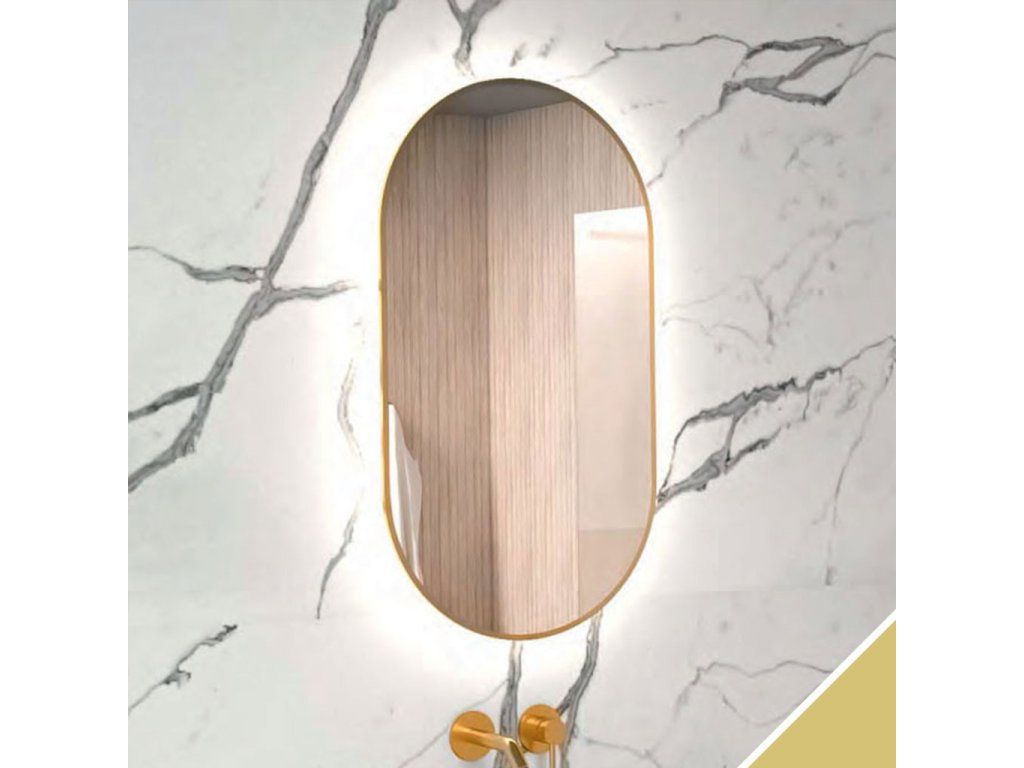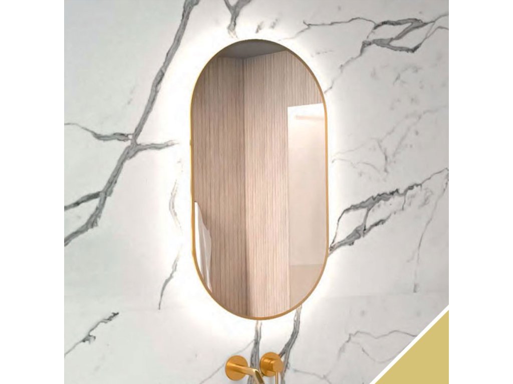 Dokonale funkčním prvkem každé moderní koupelny je zrcadlo s LED osvětlením. Takovým je i oválné zrcadlo ve zlatém kovovém rámečku Nikoletta LED 19 s LED podsvícením studeným bílým světlem po obvodu.