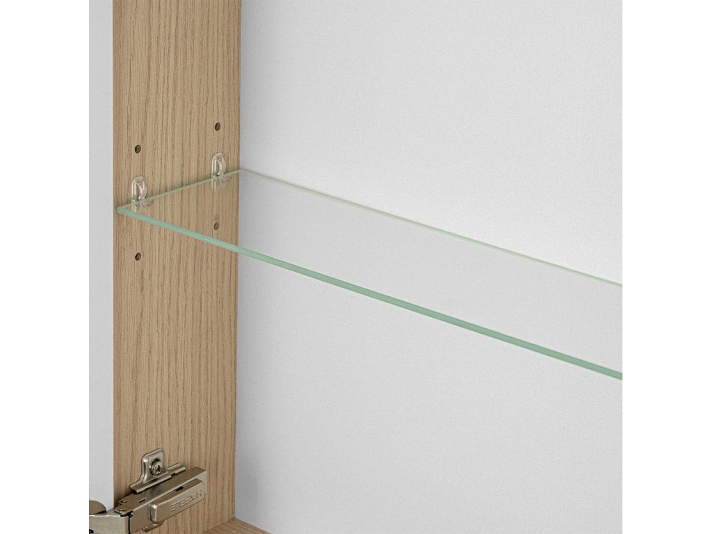 Korpus skříňky je vyroben z LTD desky tloušťky 16 mm v dekoru dub vicenza ohraněné kvalitní a trvanlivou ABS hranou. Na dvířkách z bílé LTD desky tl. 12 mm je nalepena zrcadlovina. Uvnitř skříňky je umístěná skleněná, výškově nastavitelné police.