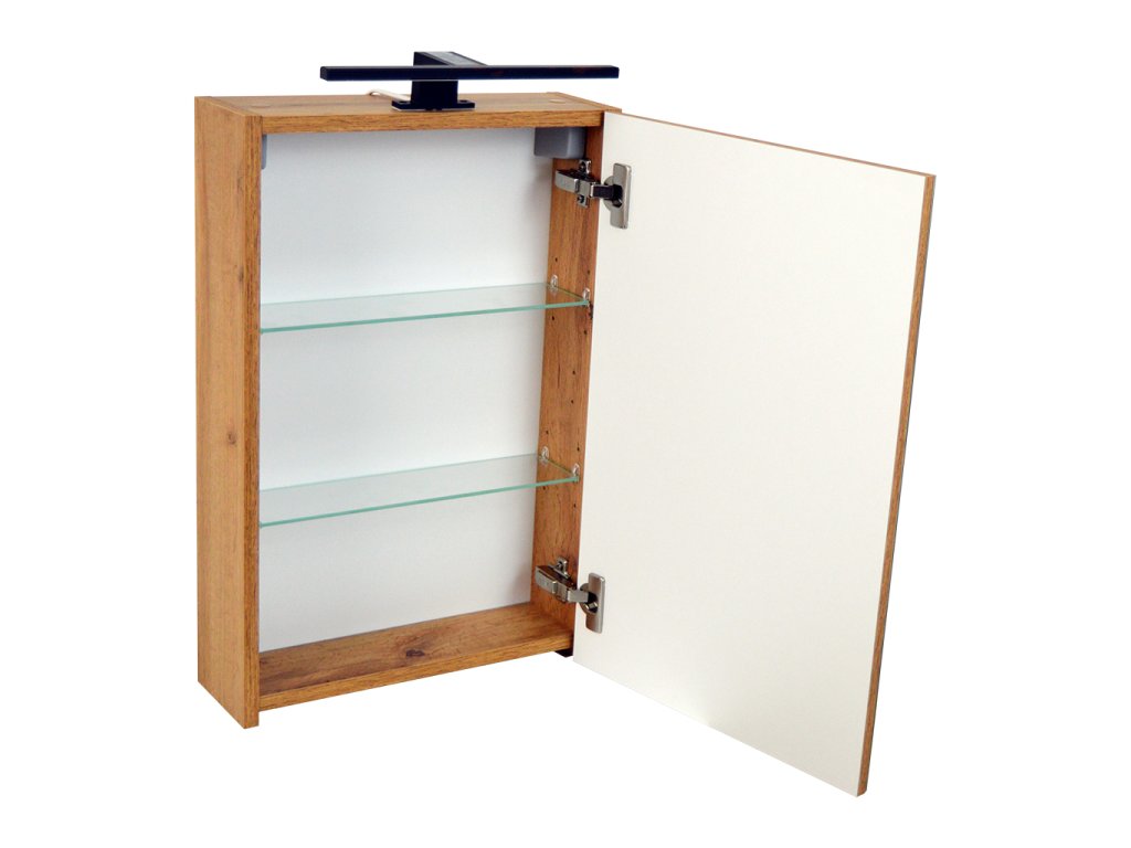 Korpus skříněk je vyroben z LTD desky tloušťky 16 mm v dekoru dub wotan. Na dvířkách z bílé LTD desky tl. 12 mm je nalepena zrcadlovina. Uvnitř skříněk jsou umístěny dvě skleněné, výškově nastavitelné police.