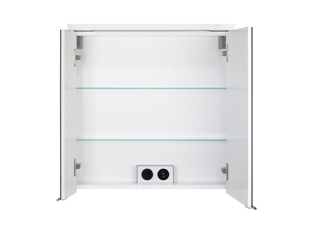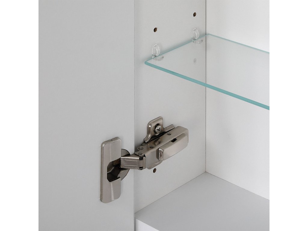 Korpus skříňky je z 16 mm LTD desky lakovaný bílým lakem ve vysokém lesku. Dvířka jsou z LTD desky 16 mm bílé barvy, na kterých je nalepena zrcadlovina.
